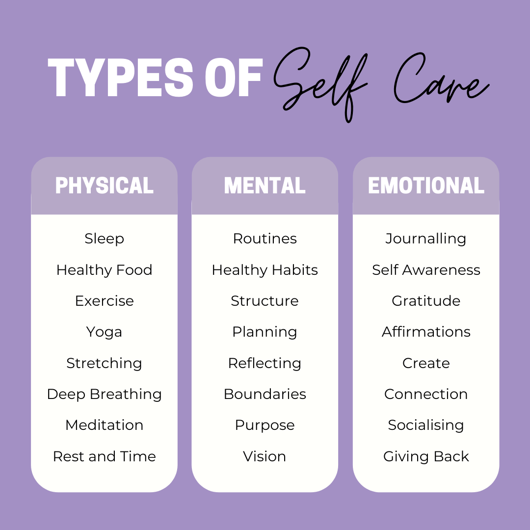 Now just because I have listed quite a few subjects under each category, this doesn’t mean you have to do all of these things, and certainly not all at once! Start slowly with making time to find space in your week for just one act of self-care in each category, and then build over time. There is no point in stressing out and rushing through your self care because that will eliminate the purpose of it! Remember your state is just as important as your work, and you will find you can get more done in less time and preserve your health.